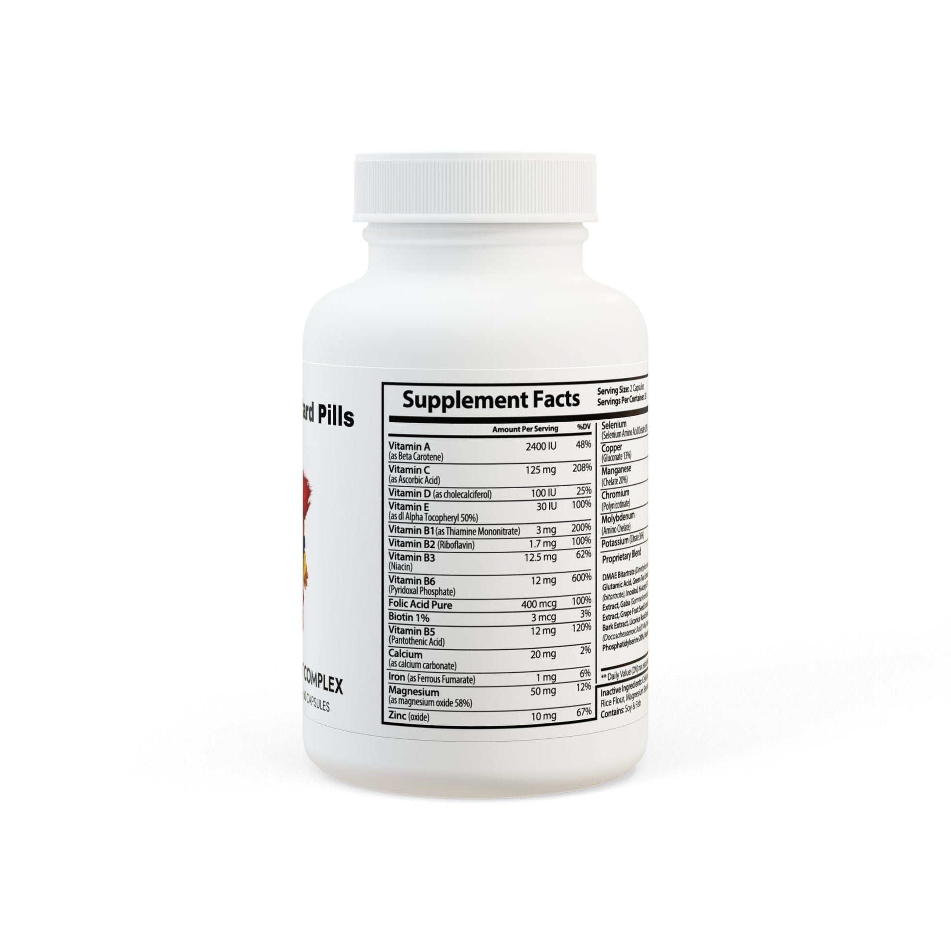 Ingredients: Vitamin A (as Beta Carotene), Vitamin C (as Ascorbic Acid), Vitamin D (as cholecalciferol), Vitamin E (as dl Alpha Tocopheryl 50%), Vitamin B1(as Thiamine Mononitrate), Vitamin B2 (Riboavin), Vitamin B3 (Niacin), Vitamin B6 (Pyridoxal Phosphate), Folic Acid Pure, Biotin, Vitamin B5 (Pantothenic Acid), Calcium (as calcium carbonate), Iron (as Ferrous Fumarate), Magnesium (as magnesium oxide 58%), Zinc (oxide), Selenium (Selenium Amino Acid Chelate 0.2%), Copper (Gluconate 13%), Manganese (Chelate 20%), Chromium (Polynicotinate), Molybdenum (Amino Chelate), Potassium (Citrate 36%), DMAE Bitartrate (Dimethylaminoethanol), L Glutamine, Glutamic Acid, Green Tea Extract, Bacopa Extract, Choline (bitartrate), Inositol, N-Acetyl L-Tyrosine, Bilberry Fruit Extract, Gaba (Gamma Aminobutyric Acid), Grape Seed Extract, Grape Fruit Seed Extract, Olive Leaf, Cinnamon Bark Extract, Licorice Root Extract, Boron (Citrate), DHA (Docosahexaenoic Acid) 14%, Vanadyl Sulfate 19%, Phosphatidylserine 20%, Huperzine A. Inactive Ingredients: Cellulose (Vegetable Capsule), Rice Flour, Magnesium Stearate, Silicon Dioxide. Contains: Soy & Fish